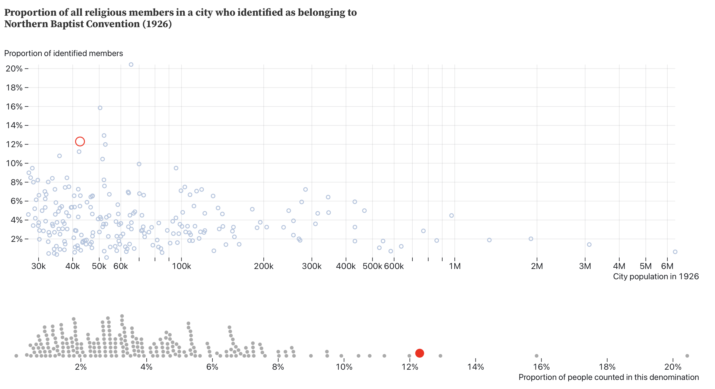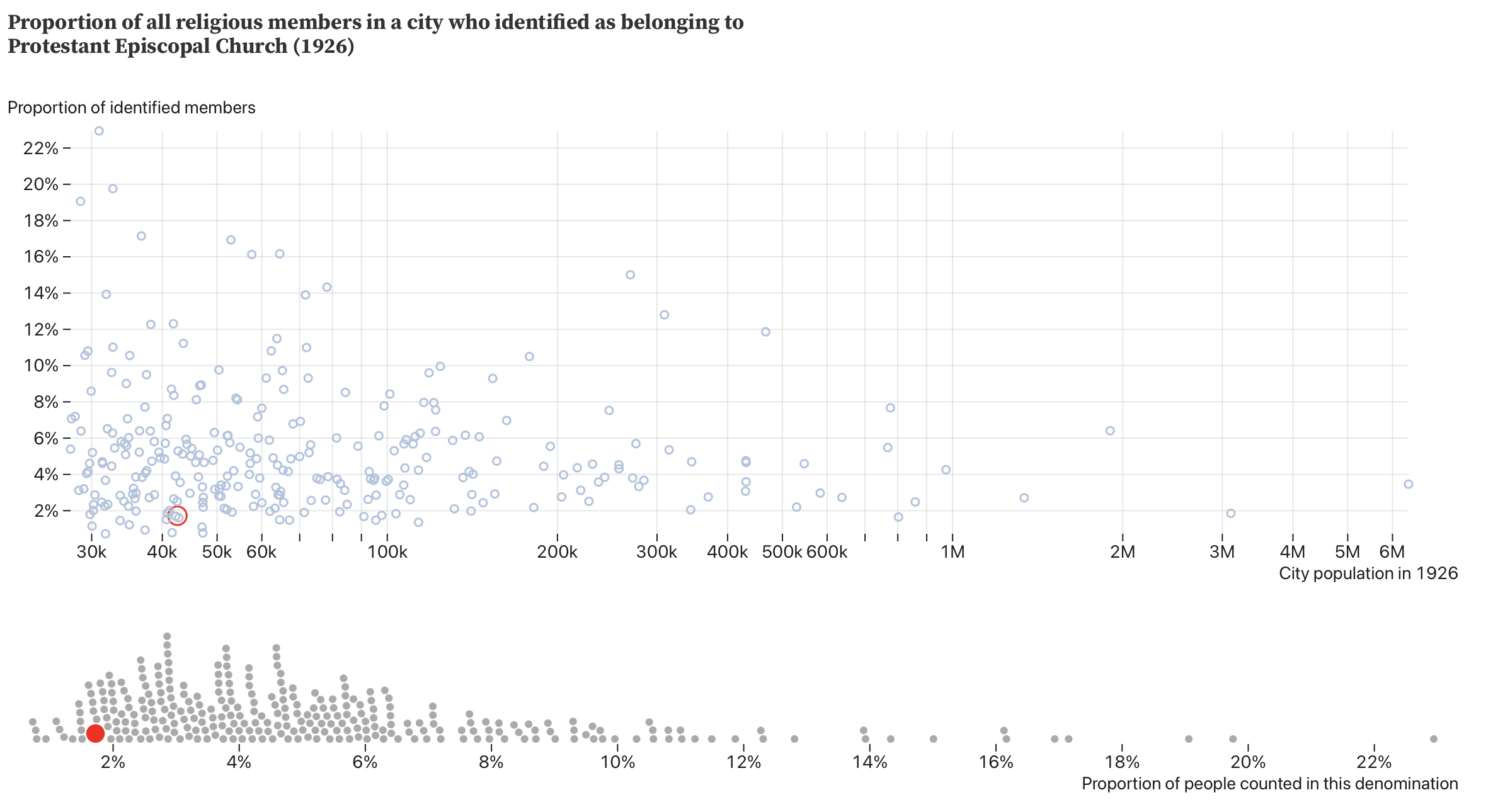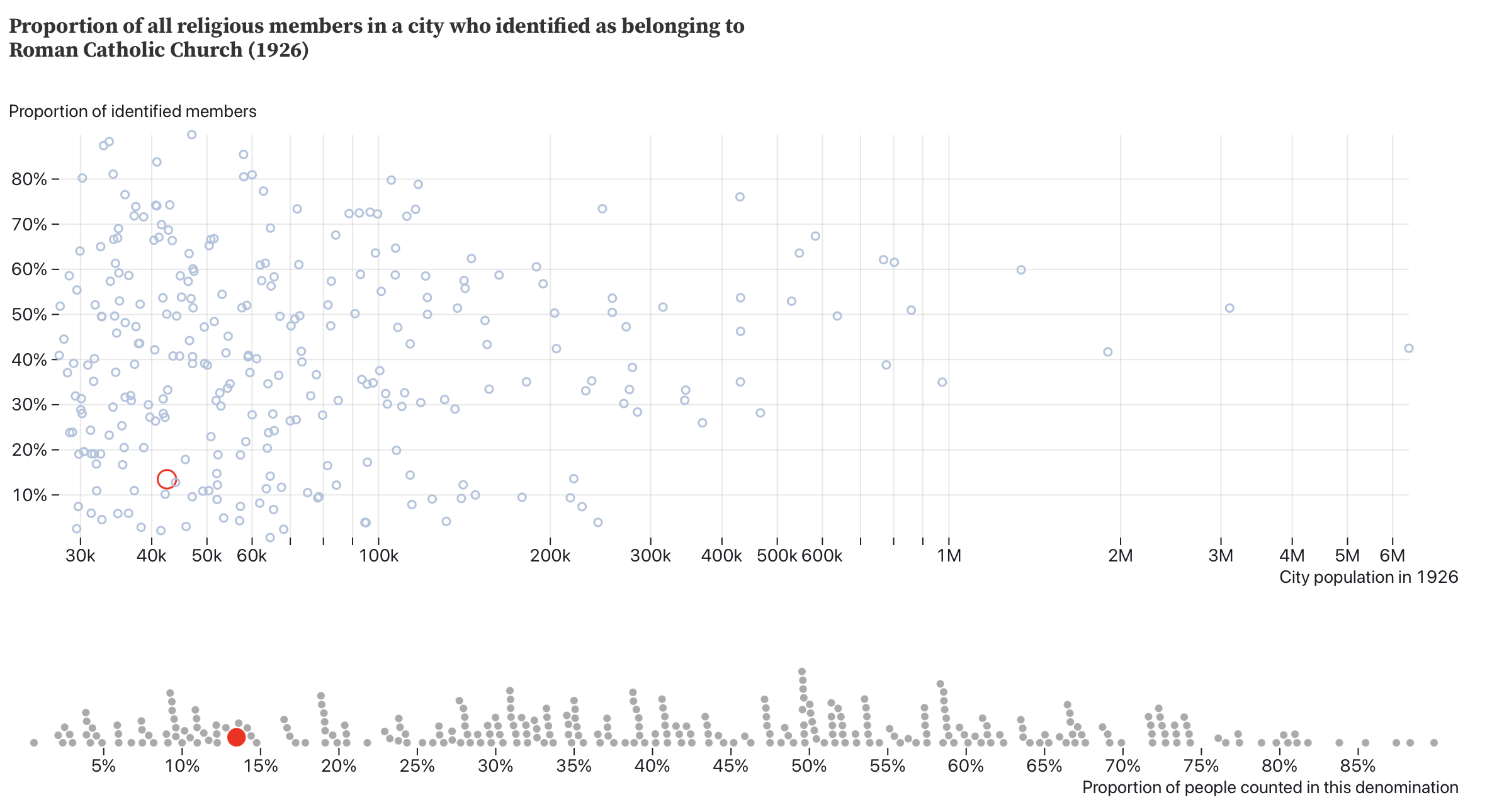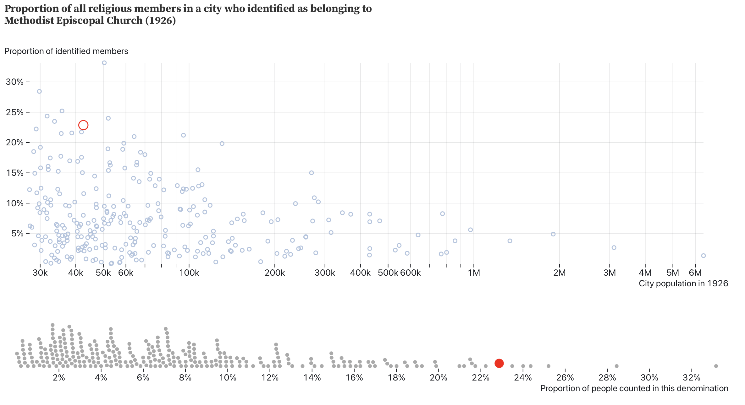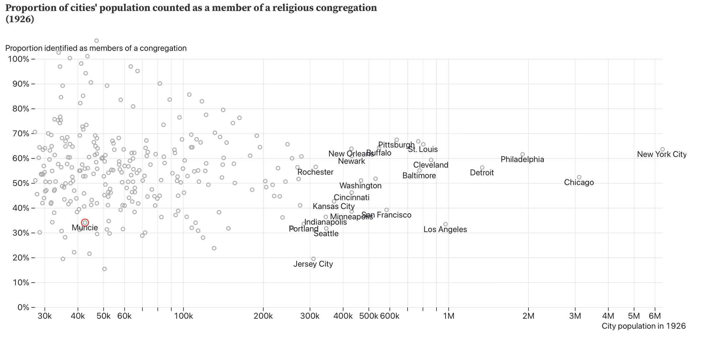 Below are a series of visualizations of the 1926 city-level data about religious membership, in each case highlighting Muncie. For now these visualizations are decidedly exploratory rather than argumentative. But they illustrate how we can understand one city’s religious ecology in relation to other cities.