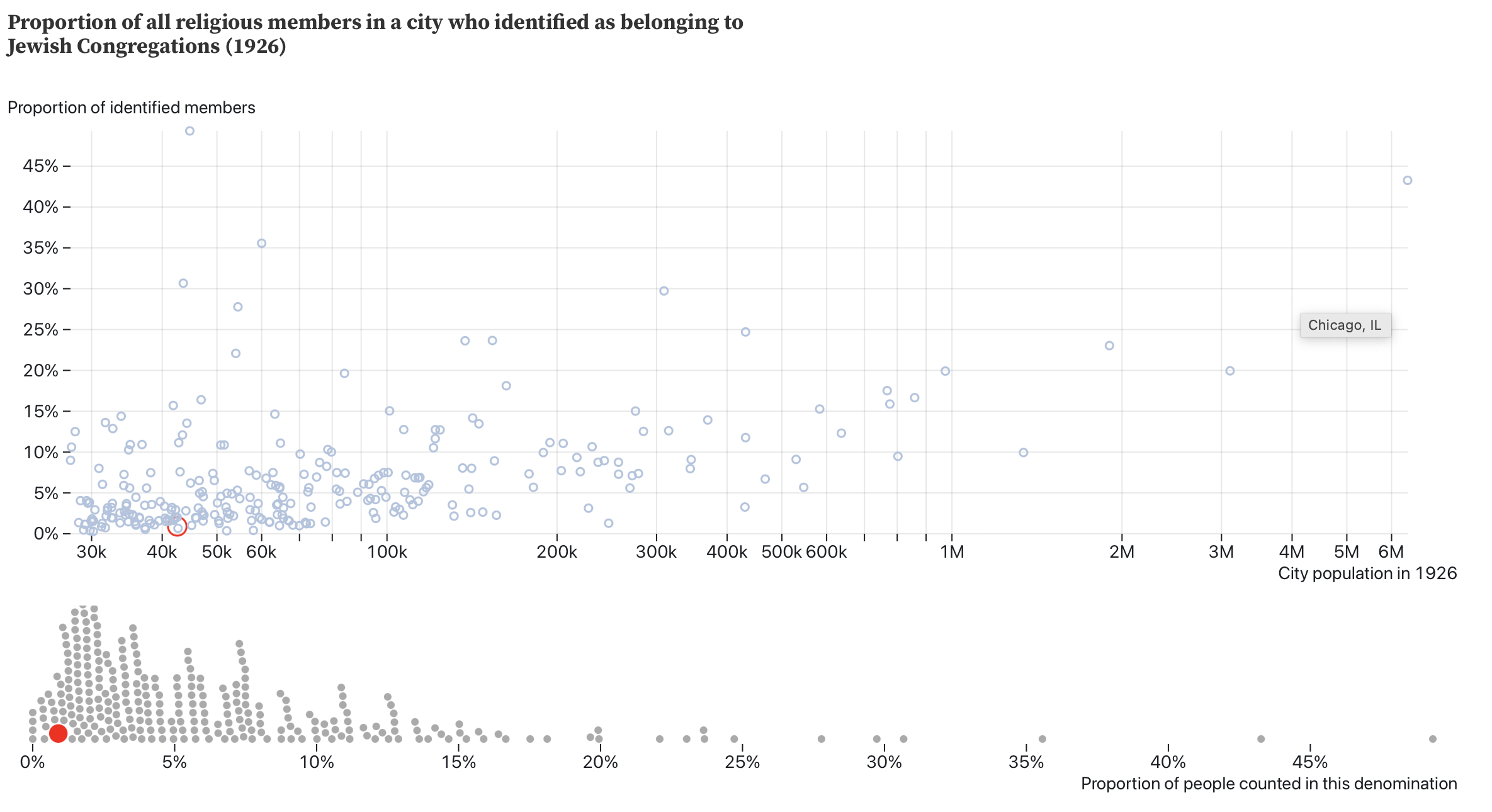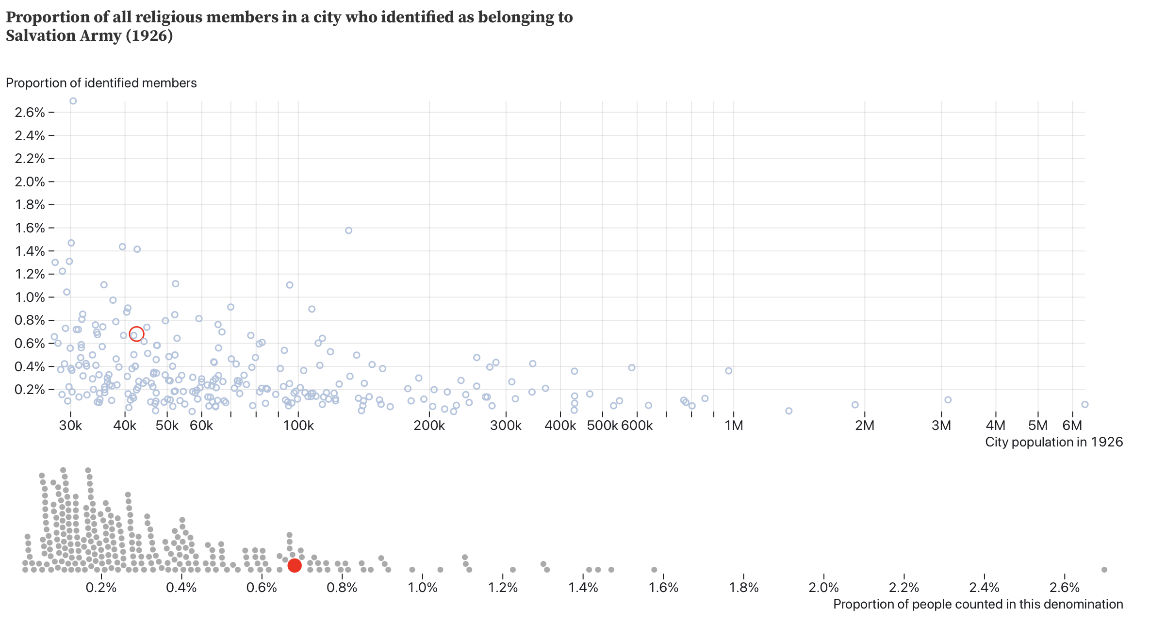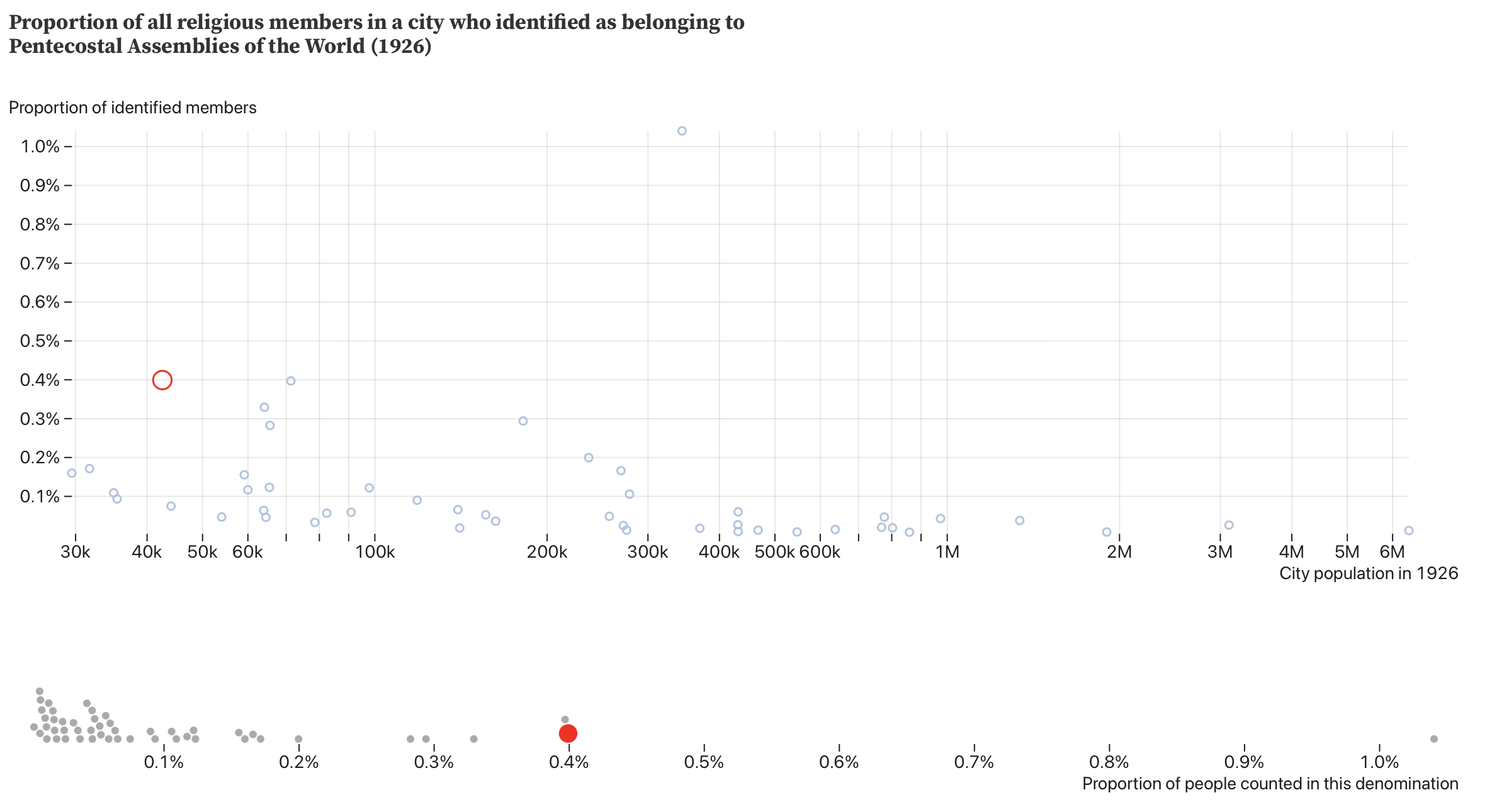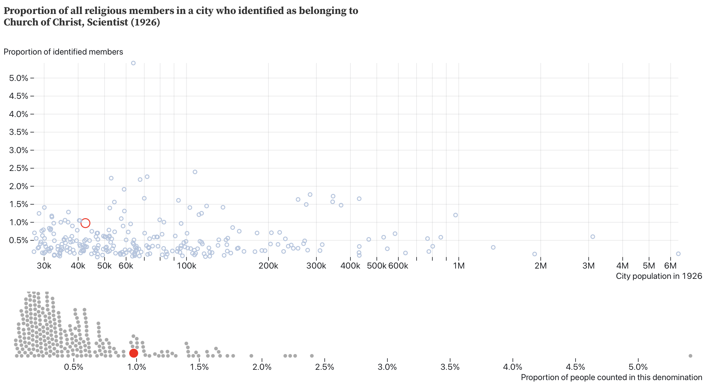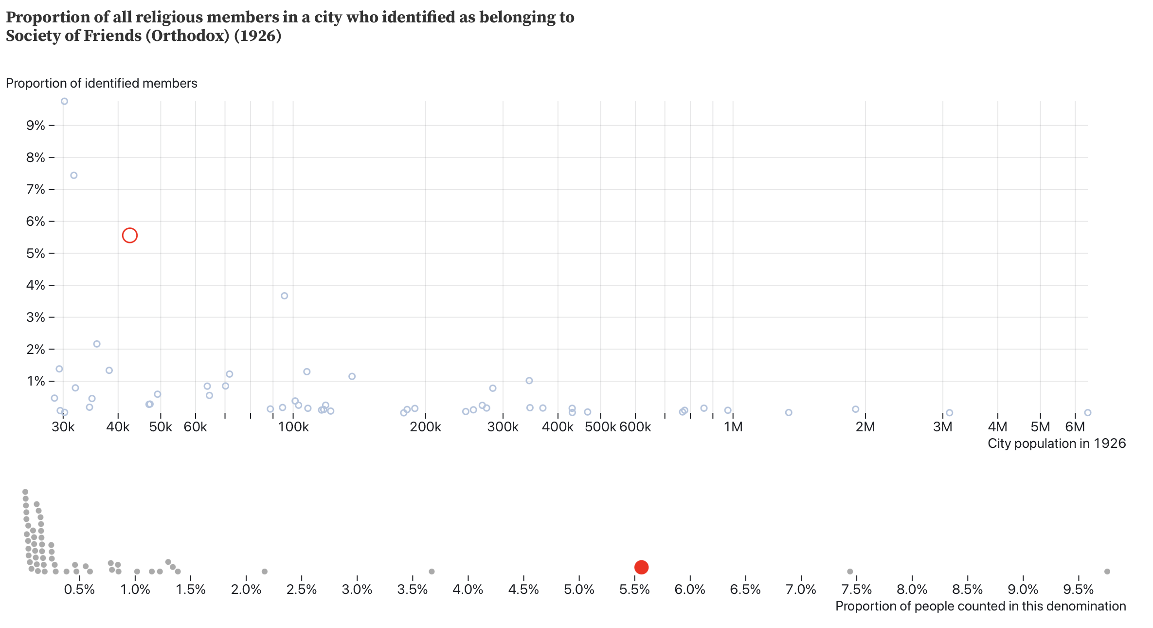 Below are a series of visualizations of the 1926 city-level data about religious membership, in each case highlighting Muncie. For now these visualizations are decidedly exploratory rather than argumentative. But they illustrate how we can understand one city’s religious ecology in relation to other cities.