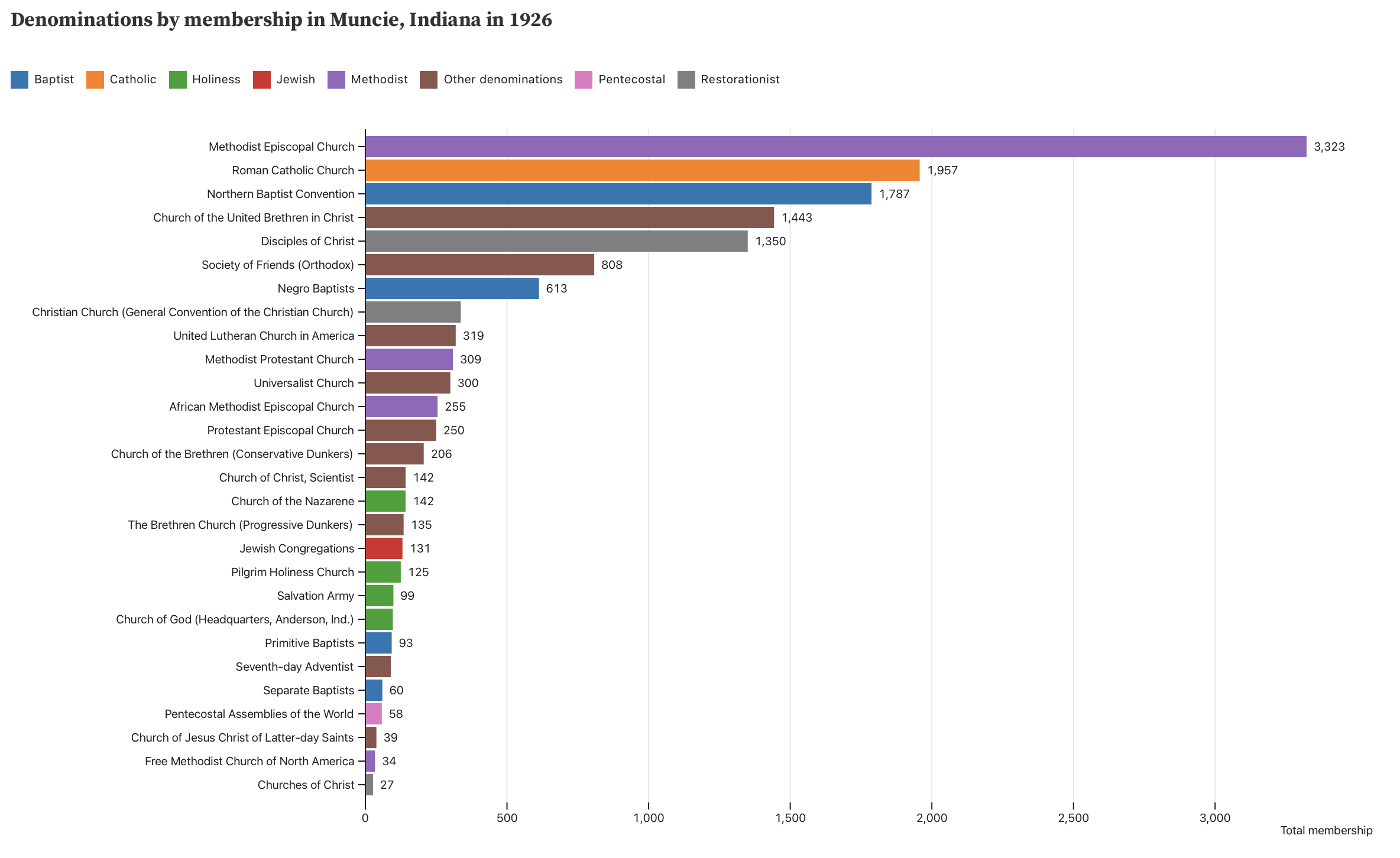 We can start just by asking which religious groups in Muncie had the most members—or at least, the most members counted by the Census Bureau. (Click on each figure to see a larger image if necessary.)